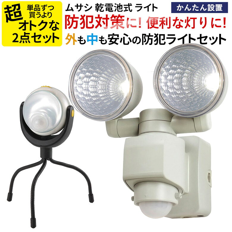 センサーライト2点セット ムサシ 1.2W×2 LEDセンサーライト (E42122WK) どこでもセンサーライト300(ASL-097) 乾電池式 防犯 防災 懐中電灯 停電 非常時 自動点灯 人感センサーライト 屋外 led センサーライト 玄関 エントランス 階段 トイレ ガレージ